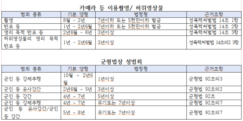 양형기준이 개정 법률을 반영하지 못하는 점도 확인되었다. 작년 10월 성폭력처벌특별법이 개정되면서 허위영상물을 영리의 목적으로 반포할 경우, 기존 ‘7년 이하의 징역’에서 ‘3년 이상의 유기징역’을 선고하도록 법정형이 바뀌었지만, 양형위원회의 기본양형은 징역 1년부터도 선고할 수 있도록 규정하고 있다. 개정 후의 기준으로 맞지 않지만, 개정 전의 기준으로도 지나치게 양형이 약하다는 비판이 제기된다.