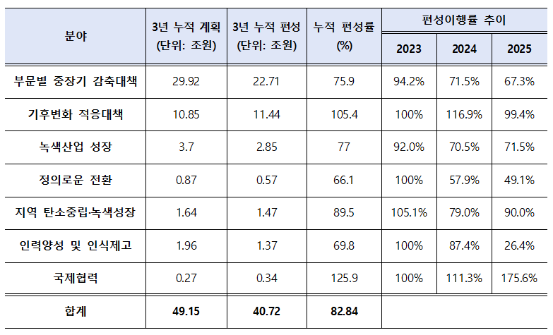 분야별로도 격차가 두드러졌다. 정부는 해당 예산을 7개 분야로 구분해 예산을 편성했는데 이중‘부문별 감축 대책’은 76%, ‘정의로운 전환 분야’는 66%, ‘인력양성 및 인식 제고’ 분야는 70%로 저조한 반면, 실효성 논란이 이어져 온 ‘국제협력(ODA 등)’ 분야는 계획 대비 126%로 오히려 초과 편성된 것으로 나타났다.