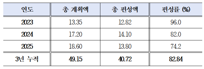 당초 정부는 2023-2025년까지 3년간 총 49조원 규모의 재정투자를 계획했으나, 실제로 편성된 예산은 40조 7천억원으로, 계획 대비 82.8% 수준에 그쳤다. 과소편성된 규모는 약 9조원에 달했다. 2023년의 경우 계획 대비 96% 수준으로 예산이 편성되었으나 2024년에는 82%, 2025년에는 74%로 해마다 큰 폭으로 축소되었다.