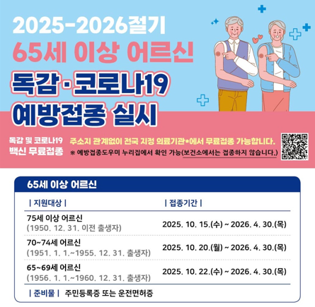 예방접종은 65세 이상 어르신을 대상으로 연령별 순차적으로 진행된다. ▲75세 이상은 10월 15일 ▲70~74세는 10월 20일 ▲65~69세는 10월 22일부터 접종이 시작된다.