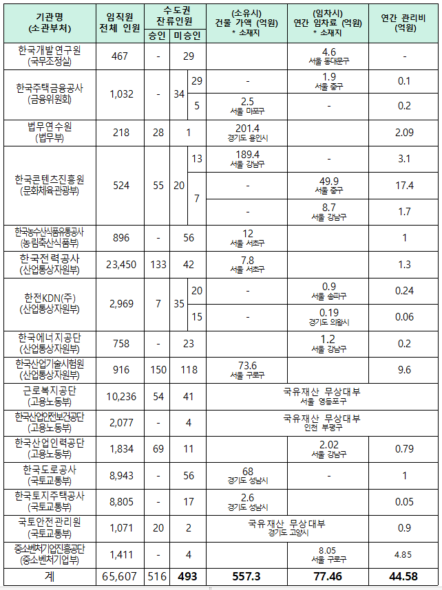 1차 이전 공공기관 16곳, 미승인 인력 493명… 16개 기관 소속 미승인 인력 근무 소유 건물 가액은 총 557억