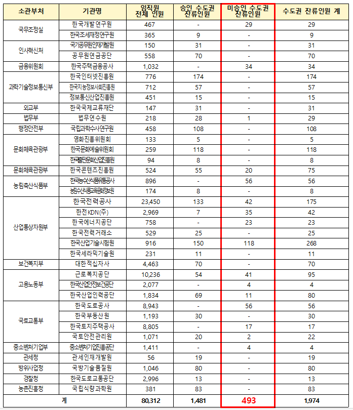 특히 이 중 지방시대위원회의 승인을 받지 않고 수도권에 남아 있는 미승인 인원이 493명에 달하는 것으로 확인됐다.