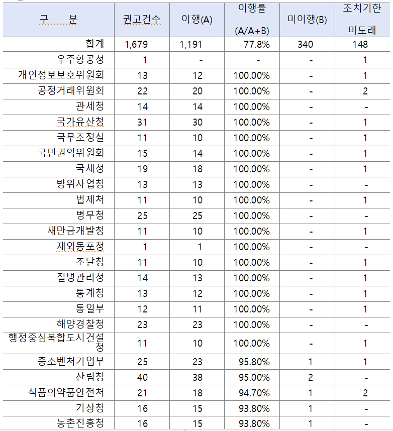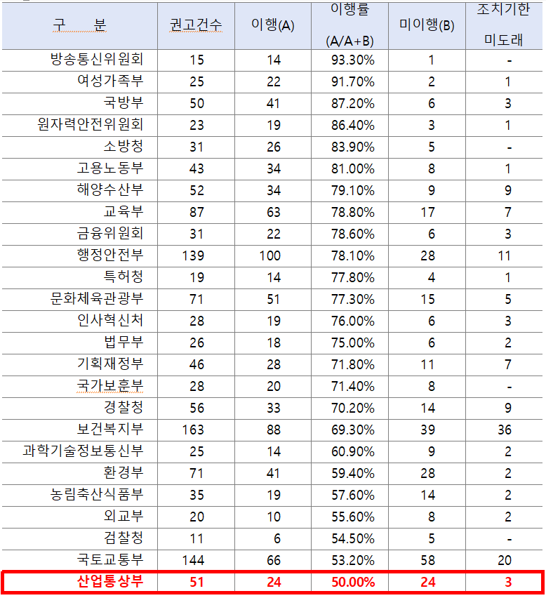 산업부는 총 51건의 권고를 받았으나 24건만 이행하고, 24건은 이행하지 않았다. 24건 중 21건은 조치기한이 도래한 건이었다.