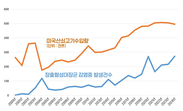 식품의약품안전처가 송 의원에게 제출한 1997년부터 2025년 2월까지 미국의 쇠고기 장출혈성대장균(O-157균)검출관련 리콜횟수는 77건이다. 이중 69%(53건)가 분쇄육(잡육)에 의한 것이다. 식약처의 수입식품정보마루에 따르면 미국산 소 위와 내장 수입량은 2023년 4,265톤, 2024년 3,522톤, 2025년 9월까지 2,494톤이다.