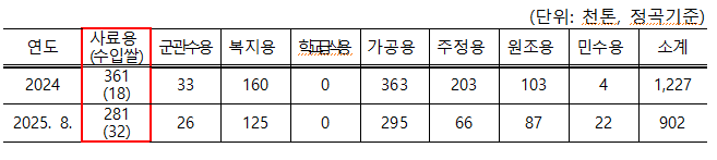 또한 국제사회 기여 및 쌀 재고 소진을 목적으로 올해 역대최대 물량인 15만t의 쌀을 ODA 해외 원조로 지원하면서 수입쌀을 원조용으로 활용한 물량은 10% 1,5000t에 불과했다.