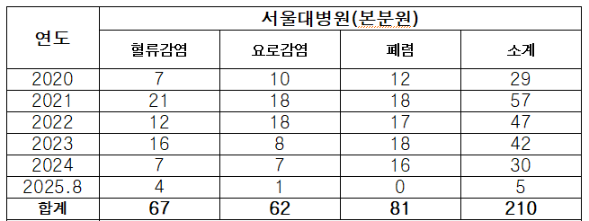 올해(8월 기준) 감염사고는 총 110건이 발생했으며, 혈류감염 57건, 요로감염 35건, 폐렴 18건으로 확인됐다.