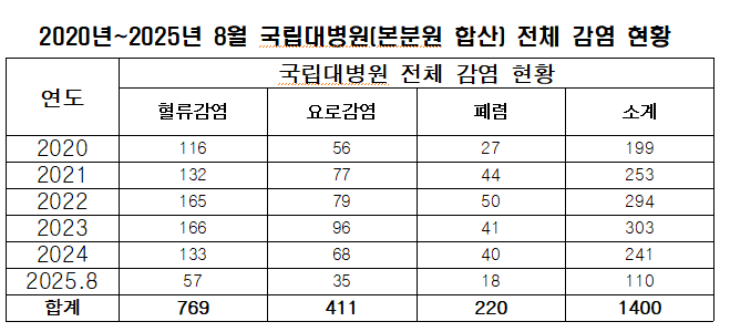 국회 교육위원회 소속 문정복 의원(더불어민주당·경기 시흥갑)이 10개 국립대병원으로부터 제출받은 자료에 따르면, 2020년부터 올해 8월까지 국립대병원에서 발생한 원내 감염사고는 총 1,400건으로 집계됐다.