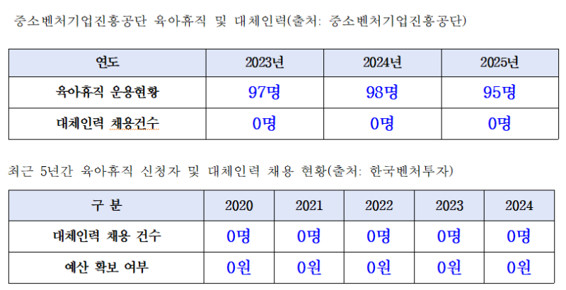 김동아 의원은 중기부 및 산하기관 육아휴직 현황을 전수조사한 결과, 공공기관의 육아휴직 대체인력 채용이 매우 미흡하다고 밝혔다. 특히 매년 약100여명의 육아휴직자가 나오는 중소벤처기업진흥공단의 경우 최근 3년간 대체인력 채용은 전무한 것으로 나타났다. 한국벤처투자도 상황이 다르지 않았다.