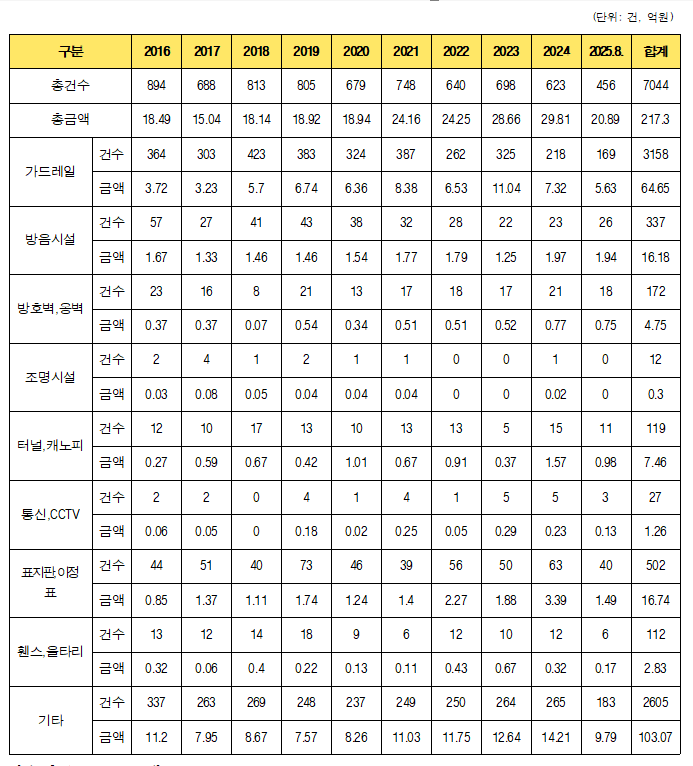 파손 시설물 유형별로는 가드레일이 3,158건(31.58억원)으로 전체의 45%를 차지해 가장 많았고, 다음으로 ▲표지판‧이정표 502건(16.74억원) ▲방음시설 337건(16.18억원) ▲방호벽‧옹벽 172건(4.75억원) ▲휀스‧울타리 112건(2.83억원) 등의 순으로 나타났다.
