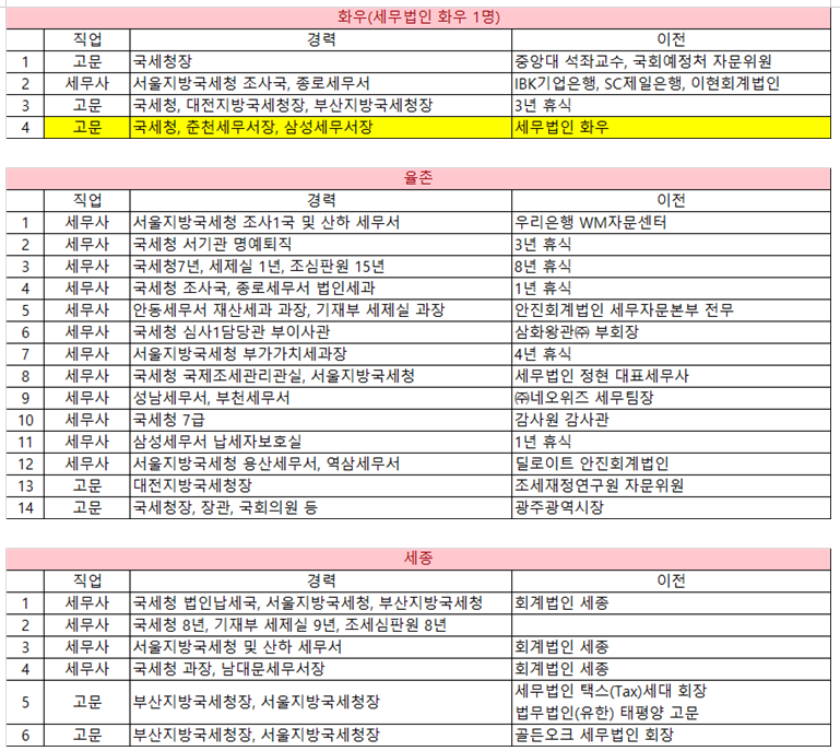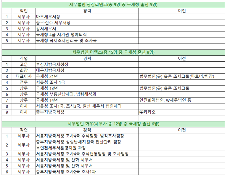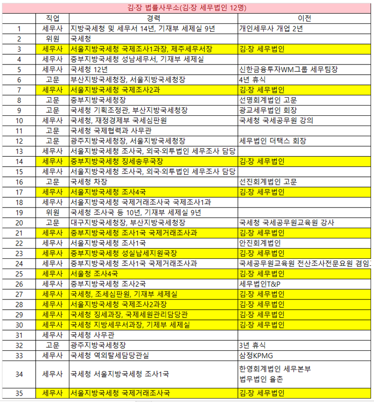김앤장 법률사무소 12명, 법무법인 광장 8명, 태평양 2명, 화우 1명으로, 모두 국세청 퇴직 이후 로펌과 관련된 세무법인에서 3년가량 근무한 뒤 해당 로펌으로 자리를 옮긴 사례들이다.