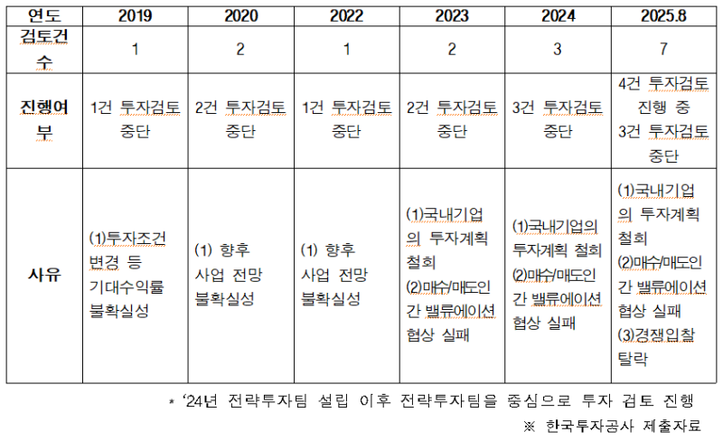 16일 국회 기획재정위원회 박민규 의원(더불어민주당)이 KIC로부터 받은 자료에 따르면, 2019년부터 2024년까지 5년간 해외 진출 공동투자 목적으로 검토된 사업은 총 9건이었으나, 모두 ‘투자검토 중단’으로 결론 났다. 주요 사유는 ▲ 국내기업의 투자계획 철회 ▲ 사업전망 불확실성 ▲ 기대수익률 불확실성 등이었다.