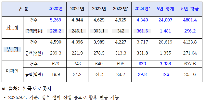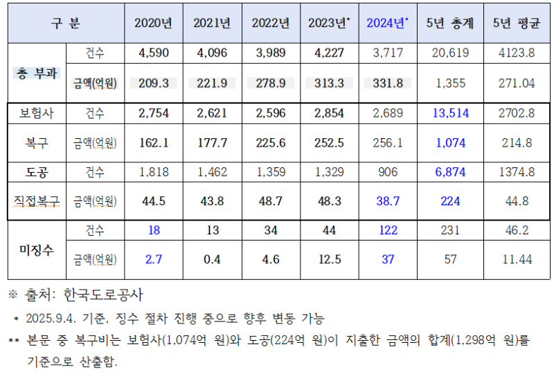 미징수 건수만 봐도 2020년 18건(2.7억 원)에서 2024년 122건(37억 원)으로 6.7배 증가했다. 복구비 부담이 국민 세금과 통행료로 전가되는 구조가 고착화되고 있는 것이다.