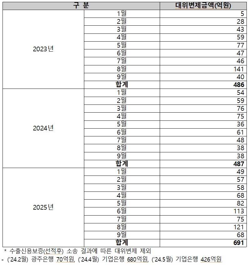 실제로 공사가 수출업체 대신 채무를 상환한 대위변제금은 2023년 486억 원, 2024년 487억 원에서 올해 691억 원으로 40% 이상 급증했으며, 8~9월만 비교하면 작년 76억 원에서 올해 189억 원으로 2.5배 증가했다.