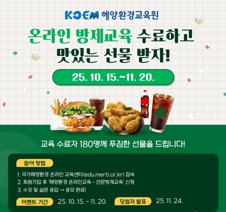 해양환경공단(이사장 강용석) 소속기관 해양환경교육원(원장 나선철)은 10월 15일부터 11월 20일까지 5주간 ‘온라인 방제교육 국민참여 이벤트’를 실시한다.
