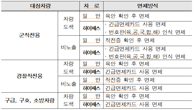 긴급면제카드는 「유료도로법」에 따라 수사·치안·구급·소방 등의 공무 목적으로 운행되는 차량에 발급되는 전용 하이패스 카드로 25년 현재 총3만6천여 장이 사용중이다.