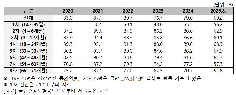 이를 차수별로 보면 2024년 기준, 짧은 검진기간(생후 14일~35일)으로 검진 안내기한이 촉박한 1차 건강검진의 수검률은 55.5%에 불과했다.