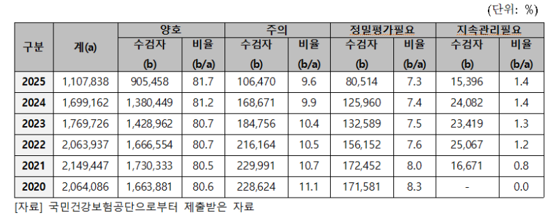검진 결과 10명 중 2명은 주의나 정밀평가 등 관리가 필요한 만큼, 보다 적극적인 검진률 제고가 필요하다.