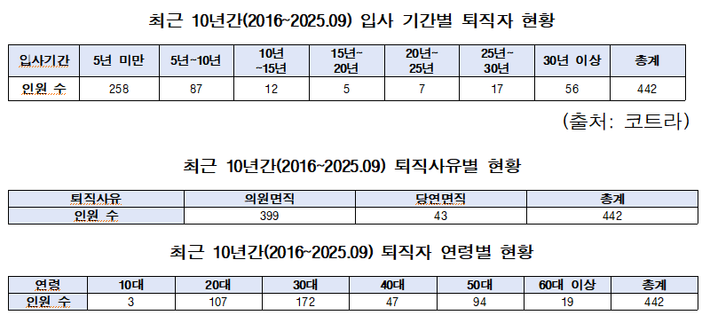 코트라에 따르면, 2016년부터 2025년 9월까지 퇴직자는 총 442명으로, 이 가운데 258명(58%)이 입사 5년 이내에 회사를 떠났다. 특히 자발적 퇴직(의원면직)이 399명으로 전체 퇴직자의 90.3%를 차지했다.