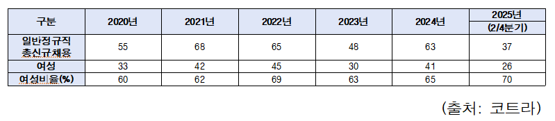 하지만 코트라 업무 특성상 해외 순환근무와 육아 병행의 어려움으로 인해 여성 직원들이 장기근속에 불리한 구조를 안고 있다는 것이 문제로 꼽히고 있다.