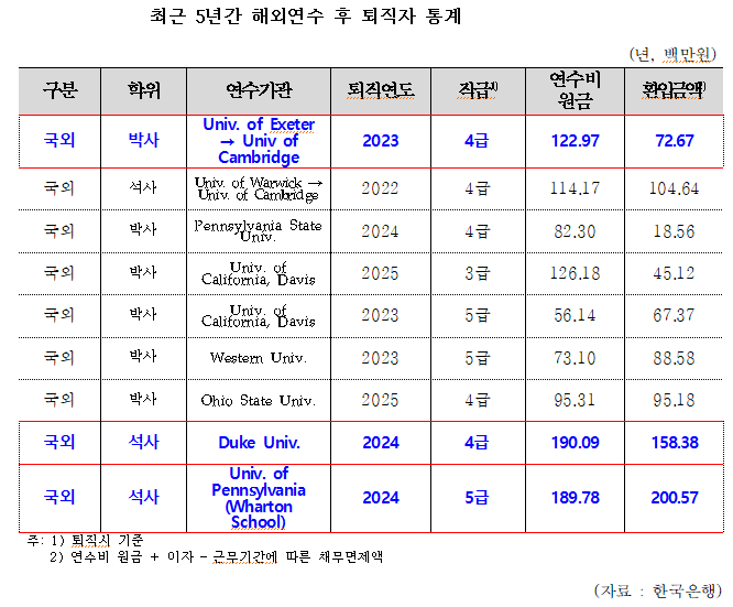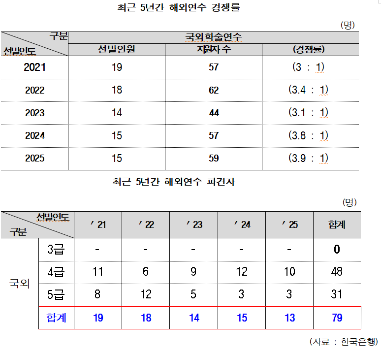 한국은행은 매년 약 15명을 선발해 해외 MBA·석박사 과정 연수에 등록금·체재비·항공비를 전액 지원하고 월급까지 지급하고 있다. 최근 5년간(2021~2025년) 총 79명에게 77억 1,800만 원이 지원되었으나, 이 가운데 9명(11.4%)이 조기 퇴사한 것으로 나타났다.