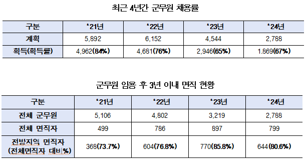 채용이 되더라도 문제다. 신규 임용 후 3년 이내 그만두는 면직자들의 규모가 상당하다. 문제는 전체 군무원 면직자의 80%가 전방지역 군무원이라는 점이다. 전방지역은 군사적 긴장