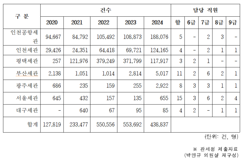 박민규 의원 “세관 직원이 감당하기 어려운 업무량...인력확충 등 제도개선 시급”