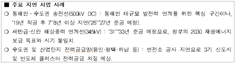 한전은 지연 사유로,① 주민수용성 부족 및 보상지연, ② 인허가 및 환경영향평가 절차 장기화, ③ 재생에너지 연계사업 승인 지연, ④ 부지 확보 난항 등을 꼽았다. 이들 요인은 단기간에 해소하기 어려운 구조적 문제로, 결국 송전망 건설 속도가 정부의 재생에너지 확충 계획을 따라가지 못하고 있다.