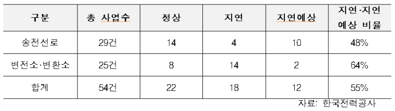 기후에너지환경노동위원회 박정 의원(더불어민주당, 파주시을)이 한전으로부터 제출받은 자료에 따르면, 제11차 전력수급기본계획에 포함된 총 54건의 송·변전설비 건설사업 중 30건(55%)이 계획 대비 지연 또는 지연예상 상태인 것으로 나타났다.
