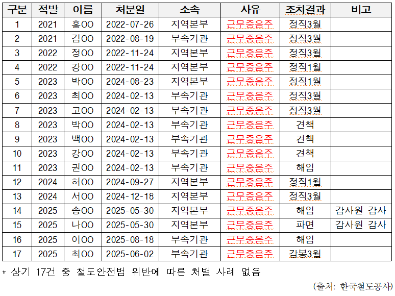 최근 3년(`23.~`25.10.) 간 철도기관사 10명 음주 적발... 징계는 단 1명