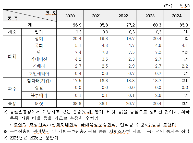 특히 지난해(2024년)에만 로열티 85억9천만 원을 지급했으며, 이는 전년(80억3천만 원) 대비 7.0% 증가한 수치다. 로열티를 지급한 품목은 딸기, 버섯, 장미 등 10개 품목이며, 이들 품목의 평균 종자 국산화율은 35.2%로 전년 대비 0.8%p 하락했다.