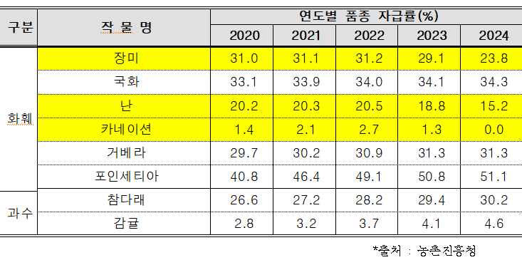 화훼분야의 국산화율은 전체 품목 중 가장 낮은 수준이다. 카네이션의 경우 2022년 2.7%였던 국산화율이 지난해에는 국산 품종이 단 한 송이도 재배되지 않았다. 장미(23.8%), 난(15.2%)도 전년 대비 각각 7.4%p, 5.3%p 감소했다.