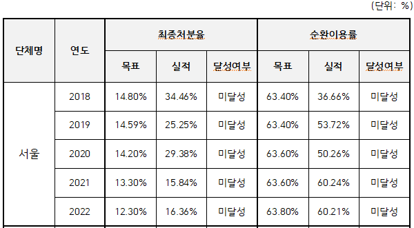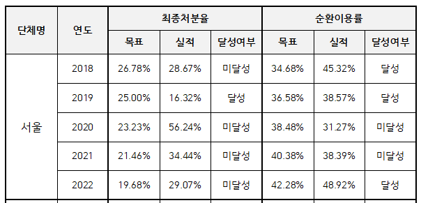 23일  국회 행정안전위원회 소속 모경종 의원(인천 서구병)이 환경부로부터 제출받은 ‘최근 5년간(2018~2022) 시도별 순환경제 성과관리 목표달성 현황’ 자료를 분석한 결과, 서울시는 최근 5년간 생활폐기물 ‘최종처분율’과 ‘순환이용률’ 목표를 단 한 번도 달성하지 못한 것으로 드러났다.