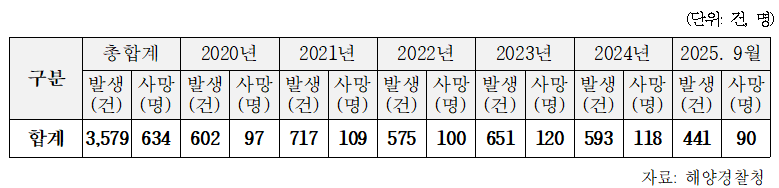 사망자 수는 2020년 97명, 2021년 109명, 2022년 100명, 2023년 120명, 2024년 118명, 2025년 9월 기준 90명으로, 총 634명으로 조사됐다.