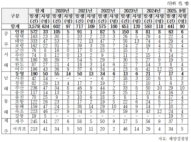 및 사망자 현황>을 분석한 결과, 최근 5년여간 연안사고가 발생한 건수는 2020년 602건, 2021년 717건, 2022년 575건, 2023년 651건, 2024년 593건, 2025년 9월 기준 441건으로, 총 3,579건으로 조사됐다.
