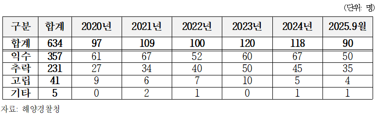 ▲최근 5년여간(2020~2025.9월) 유형별 연안사고 사망자 현황