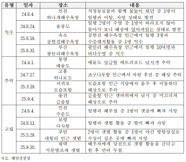▲최근(2024~2025.9월 기준) 유형별 연안사고 사망자 사례