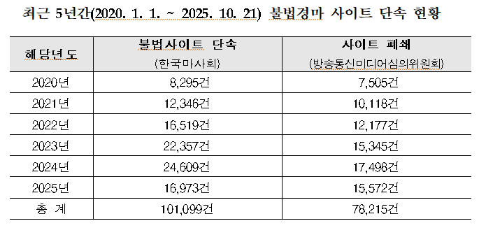 하지만 불법경마 적발 건수는 줄지 않았다. 2020년부터 2025년 10월까지 불법경마 사이트 단속 10만 1,099건 중 41%(41,582건)이 전자마권이 정식 시행된 2024년 이후에 집중됐다.