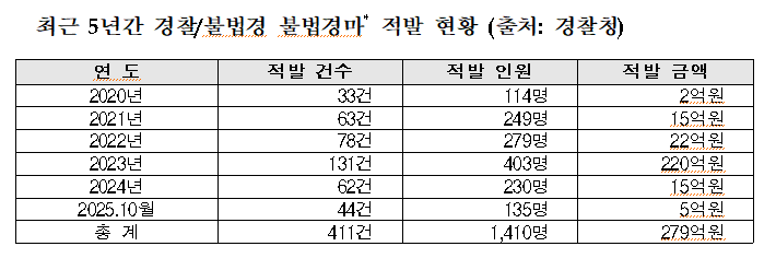 이 가운데 2024년 이후 적발된 사례가 106건(25%), 365명(25%), 20억 원(8%)에 달했다. 지난달에는 한국마사회 경주 영상을 도용해 약 1,700억 원 규모의 불법도박을 운영한 일당이 경찰에 검거되기도 했다.