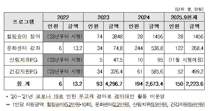 경마로 인한 도박중독 문제도 여전히 심각하다. 한국마사회가 운영하는 도박중독 예방 프로그램(경마대안 활동) 참여자는 ▲2023년 93명, ▲2024년 194명, ▲2025년 9월 현재 150명으로 매년 증가세다. 2024년 경마장 방문빈도 조사 결과, 일주일에 두 번 이상 방문(연 91회 이상)한 고빈도 이용객의 비율은 42.4%에 달했다.
