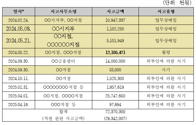 문금주 의원실(사진)이 입수한 농협은행의 ‘24년~’25년 8월 ‘농협은행 금융사고 중 대출관련 내역 을 보면 작년과 올해 발생한 대출 관련 금융사고 10건 중 5건은 직원의 횡령·배임·사기에 의한 것으로, 사고금액만 293억 원에 달했다. 직원에 의한 사고유형으로는 배임 3건, 횡령과 사기가 각각 1건씩을 차지했다.