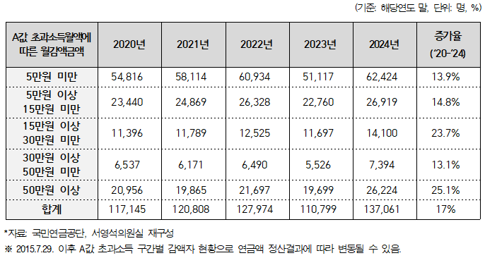2024년 한 해 동안 재직자 노령연금이 감액된 수급자는 총 13만 7,061명으로 이 가운데 5만 원 미만은 6만 2,424명, 5만~15만 원 미만 2만 6,919명, 15만~30만 원 미만 1만 4,100명, 30만~50만 원 미만 7,394명, 50만 원 이상 2만 6,224명으로 나타났다