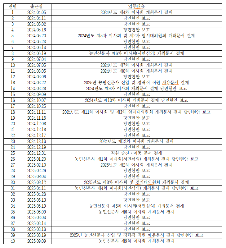 ○ 그러나 강호동 회장이 농민신문사 회장으로 취임한 이후 현재까지의 농민신문사 출퇴근 현황 자료에 따르면, 지난 2024년 3월 21일부터 올 10월 1일까지 총 560일 중 농민신문사에 출근한 날은 총 40일에 불과한 것으로 드러났다. 강 회장은 월 평균 2회 정도만 출근하면서 이사회 개최문서 결재 또는 당면현안 보고 업무만을 처리한 것으로 확인됐다.