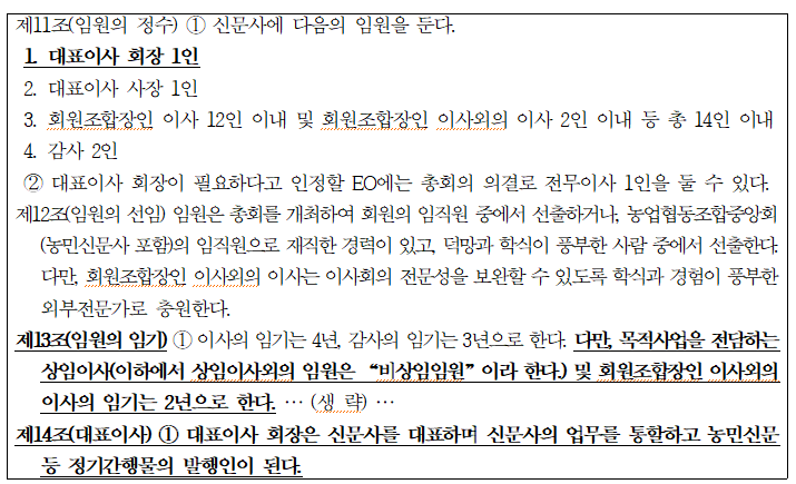 이와 관련, 농민신문사 정관에서는 회장(1인), 사장(1인), 회원조합장인 이사(12인) 및 회원조합장인 이사 외 이사(2인), 감사(2인) 등을 임원으로 두고, 이사는 4년, 감사는 3년, 목적사업을 전담하는 상임이사 및 회원조합장인 이사 외 이사의 임기를 2년으로 규정하고 있다. 이 중 회장과 사장은 목적사업을 전담하는 상임이사에 해당해 상임(상근)임원이다.