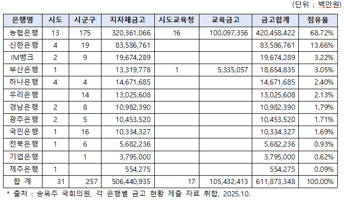 송옥주 의원(경기 화성시갑)이 은행들로 부터 받은 ‘전국 지방자치단체와 17개 시·도교육청 금고 현황’ 자료에 따르면 지자체 금고와 지방교육청 교육금고를 더해 올 9월말 기준 612조원중에서 농협은행은 68.7%, 신한은행은 13.7%를 차지해 시중은행 2곳이 지난해보다 4.5%P 증가한 82.4%를 점유했다.