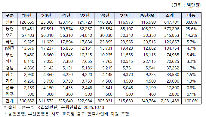 2019년부터 올 8월말까지 은행들은 지자체나 지방 교육청에 공공금고 협력사업비 2조2,315억원을 지원했다. 이중 신한은행이 38%인 8,477억원, 농협은행이 26%인 5,703억원, 우리은행이 14%에 달하는 3,159억원을 지원하고 나섰다.