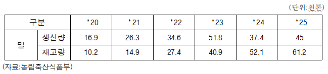 이처럼 재고가 급증하면서 국산밀 생산량도 감소세로 전환됐다. 2023년 5만1천 톤으로 정점을 찍은 뒤 지난해 3만7천 톤으로 감소, 올해도 4만5천 톤 수준에 그쳤다. 작황이 나빴던 원인도 있지만 국산밀의 판로 확보 실패가 주요 원인으로 지목된다.