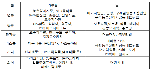 이로 인해 가루쌀 사업에는 농심·삼양·오뚜기·SPC·CJ푸드빌·신세계·파리크라상 등 대기업이 대거 참여한 반면, 국산밀 제품화 사업은 대부분 영세 중소 식품업체 위주로 참여한 것으로 확인됐다.
