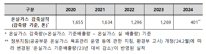 환경 부문에서도 탄소출량 감축 목표 달성에 실패한 것으로 나타났다. 수출입은행의 기준배출량 대비 탄소 배출 감축률은 2021년 32.1%, 2022년 25.5%, 2023년 24.9%로 지속 하락했으며, 2024년에는 9.1%까지 급감해 감축 실적이 급격히 악화됐다.