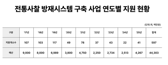 이번 해당 사업은 국비 40%, 지방비 40%, 자부담 20%의 비율로 지원됨. 2017년부터 2025년 9월까지 총 597개 사찰이 방재시스템을 구축했고, 국비 지원금만 443억 원이 투입했다.