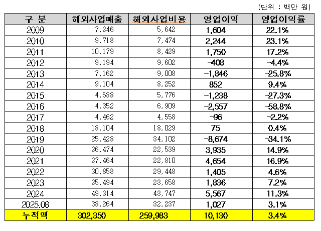 이처럼 지난 16년간 인국공 해외사업에 든 비용은 총 2,922억원(투입비용 2,903억원, 지분법손실 19억원)이었지만, 매출액은 3,025억원에 그치면서 실제 누적 수익(영업이익)은 102억원에 불과했다.